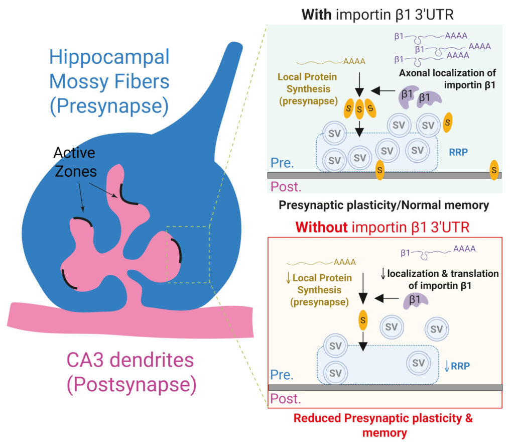 Graphical Abstract: Mechanisms linking the depletion of axonal importin β1 to impaired spatial memory via presynaptic dysfunction. The reduction in spatial and contextual memory in importin β1 Δ3’UTR mice results in impaired presynaptic plasticity of mossy fibres in the hippocampus (shown in blue on the left) and a reduction in the pool of synaptic vesicles (SVs) ready for release (Readily Releasable Pool, RRP). The results of the study show that these synaptic dysfunctions are due to a reduction in local synaptic protein synthesis (yellow bubbles/S) in the (presynaptic) mossy fiber boutton and an alteration in the synaptic phospho-proteomeand translatome. Thus, importin β1 appears to be a regulator of local protein synthesis of axonal mRNAs in the hippocampus. © Nicolas Panayotis & Philip Freund